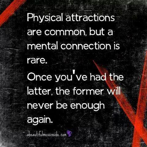 Really, it's the mind that attracts me to anyone... people who think deeply... people who feel deeply. People who strive to continually experience the depths of what life has to offer. Consciousness. That sort of connection is far more rare and endlessly more desirable to me then some spur-of-the-moment physical attraction. Minds that happen to meet on the same ruminating plain, in the same moment, however brief, vibrating at the same frequency. That's the kind of shit that can make my knees weak. The connections where silence has just as much meaning as the verbal interaction. Where nothing is forced or rehearsed, there is a flow that can be felt between the two people, but the words to describe it escape them.
